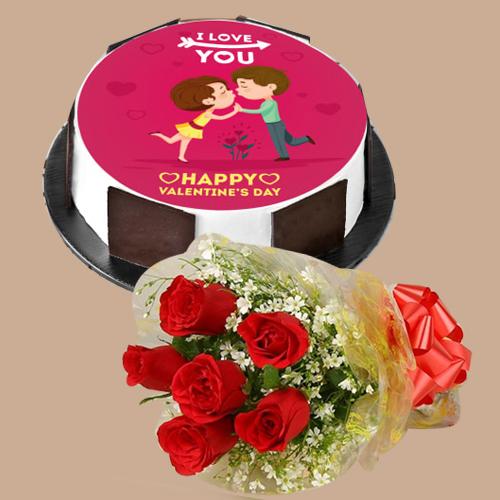 Shower the loved ones in your life with your love conveyed in the form of this Sumptuous Vanilla Flavor Photo Cake (1 lb) with 6 Red Roses Hand Bunch and make the celebration for Valentines Day grander.