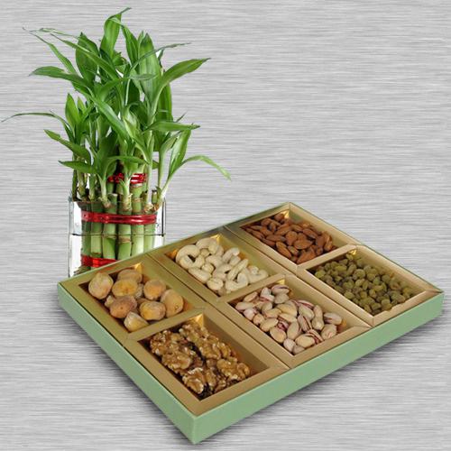 Deliver this special Mother�s Day Gift Combo of Health & Luck for Mom & praise her for her commitment towards you. This unique combo gift has 1 kg dried nuts like Almonds, Cashews, Raisins, Peanut & Walnuts with a 2 Tier Lucky Bamboo Plant.