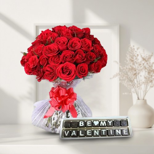 Merge your love with this V-day Welcoming Gift of 12 Red Roses Bouquet with Be My Valentine Hand Made Chocolate and send it to your dearest ones.