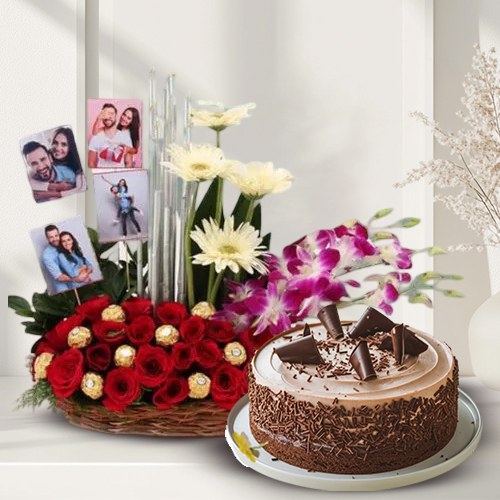 Make your Valentines Day celebration a joyous one with this gift of Love Filled Flowery, Chocolaty N Personalized Picture Basket with Chocolate Cake and carve a perfect way to celebrate the most sacred feeling called love. This enigmatic Basket Arrangement comprises of 20 Red Roses, 3 Orchid stems and 4 White Gerberas with 8pc Ferrero Rocher Chocolates and Personalized Photo (4 to 5 nos) and comes along with a delectable Chocolate Cake (500g).