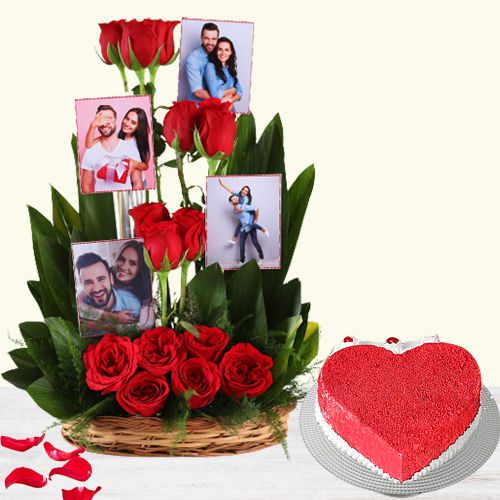 Celebration special wishes are best delivered by gifting this Heart Shaped Red Velvet Cake (500g) with a Basket Arrangement of 15 Red Roses with 4 Personalized Photos to your family and friends.