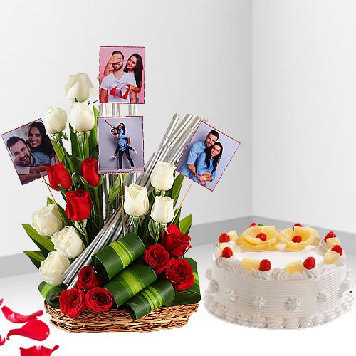 This arrangement is made of: � 18 Red N White Roses � 4 Personalized Photos � A Basket � A Pineapple Flavor Cake (1Lb)