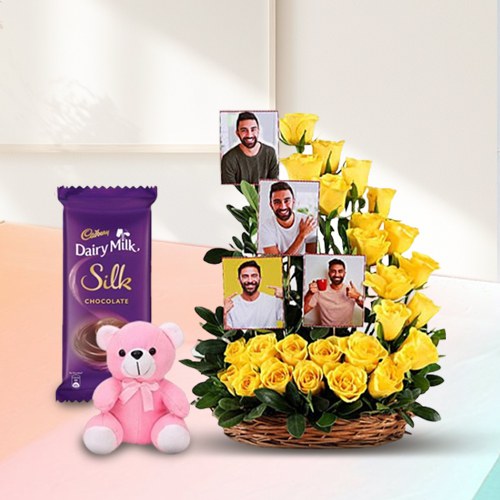 Send lovely wishes with this Beautiful Basket Arrangement of 25 Yellow Roses and Personalized Pictures (4 to 5 nos) which is amazingly paired with a Cute 6" Teddy and a Cadbury Dairy Milk Silk Chocolate Bar and spread love among the people you care for.