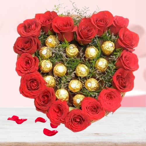 Give this incredible Valentines Day gift of Gorgeous 18 Red Roses and 16pc Ferrero Rocher Heart Shape Bouquet to express the tenderness of your love for someone you adore.