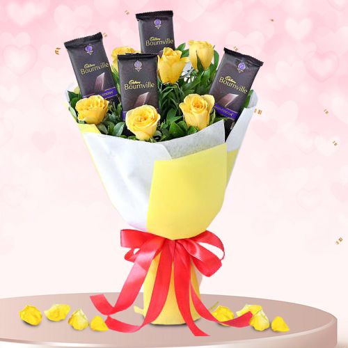 A very special gift for Valentines Day, this Ravishing Bouquet 6 Yellow Roses n 4pc Cadbury Bournville Rich Cocoa Dark Chocolate Bar (31g each) will mesmerize the people you love from the core of your heart.