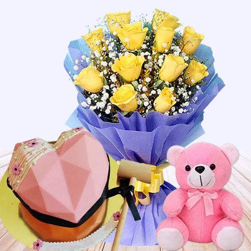 Do something special on Valentines Day by gifting this Unique 12 Yellow Roses Bouquet in tissue wrapping, Heart Shape Strawberry Flavor Hammer Cake (500g) and a cute 6" Teddy that will bring everlasting joy into the life of your dear ones.