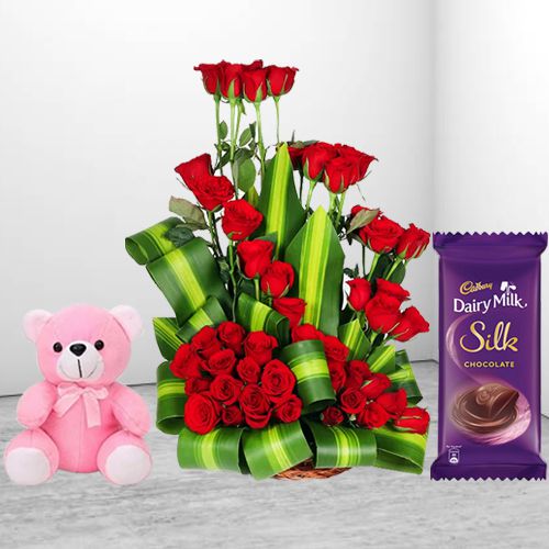 Convey your deepest feelings to your loved ones with this gift of Spectacular 36 Red Roses Arrangement with a Cute Teddy (15cm) N a Cadbury Dairy Milk Silk Chocolate Bar (60g) to render the best Valentines Day they have ever come across.