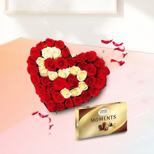 Express your valuable feelings and wishes on Valentines Day with this Chocolaty Love N Rosy Heart Gift Combo that will be treasured forever by your loved ones. This Valentine gift combo is composed of Heart Shape Flower Arrangement of 40 Red and White Roses and a 16 pcs Ferrero Rocher Moment Chocolate Box.