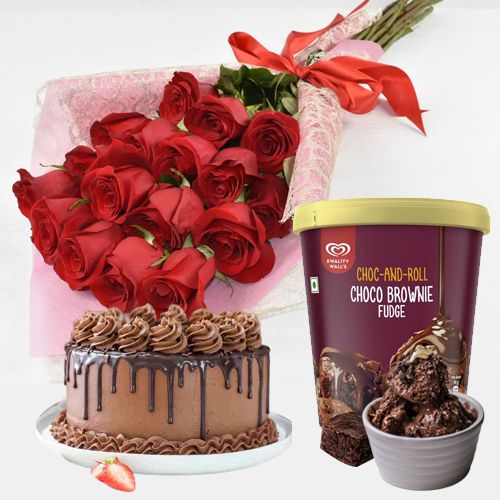 Express your deepest love to your dear ones by sending them this Special Combo of Kwality Walls Choc-n-Roll Choco Brownie Fudge Ice Cream Tub (700ml) and 18 Red Roses Bouquet which is coupled with a Chocolate Cake (500g) and make Valentines Day more memorable.
