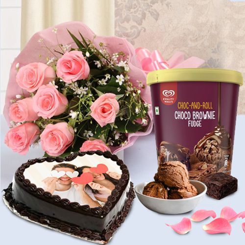 Make the moments special for your dear ones by sending them this Magnificent Combo of 8 Pink Roses Tissue Wrapped Bouquet with a Kwality Walls Choc-n-Roll Choco Brownie Fudge Ice Cream Tub (700ml) n a 1lb Heart Shape Photo Cake and incorporate happiness in their life on Valentines Day.