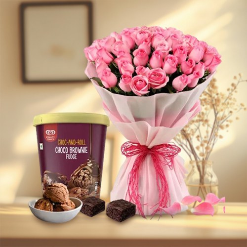 Present to him/her on Valentines Day, this gift of Fantastic 36 Pink Roses Bouquet in tissue wrapping with a Kwality Walls Choc-n-Roll Choco Brownie Fudge Ice Cream Tub (700ml) to make their dreams come true.