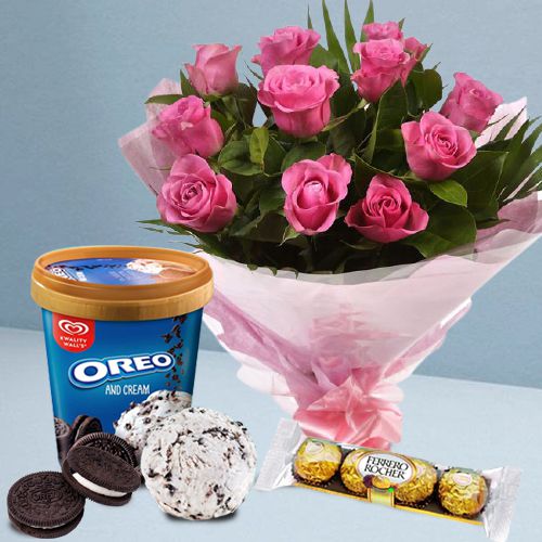Be the most romantic person in your loved ones eye on Valentines Day by sending this Rendering Love Combo of 10 Pink Roses Bouquet in tissue wrapping with a Kwality Walls Oreo N Cream Ice Cream Tub (700ml) and 4pcs Ferrero Rocher Chocolate Box and gain appreciation for your choice.