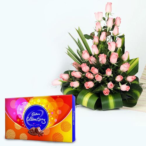 Make your Valentines Day more memorable with this Lovers Story gift of 30 Pink Roses Arrangement in a Cane Basket with a Cadbury Celebrations Assorted Chocolate Gift Pack (180.8g) and curve your name on the hearts of the people you love.