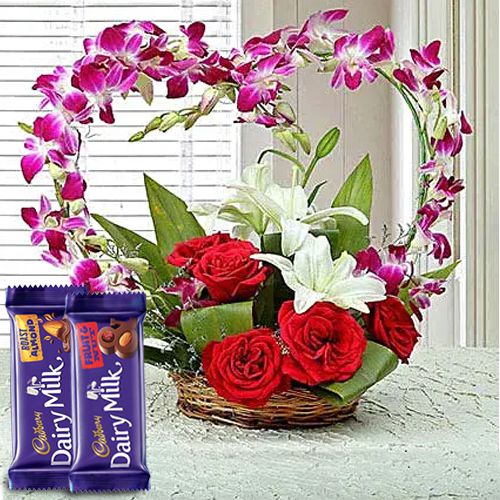 Enrich the flavor of love on Valentines Day with this Heart Shape Basket Arrangement of 5 Red Roses, 4 Purple Orchids and an Asiatic Lily (1*3 buds/flowers) which is specially paired with a Cadbury Dairy Milk Roast Almond Chocolate Bar (36g) and a Cadbury Dairy Milk Chocolate Bar - Fruit and Nut (36g) and see the joy it brings to the life of the recipient.