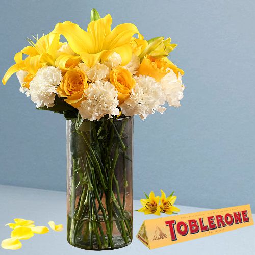 Send to the people you love, this special gift of Season of Love Arrangement of 10 Yellow Roses, 10 White Carnations, and a Yellow Asiatic Lily (1*3 buds/flowers) which are arranged in a Cylindrical Glass Vase and also perfectly paired with a Toblerone Milk Chocolate with Honey and Almond Nougat Pouch (100g) which is perfect for celebrating Valentines Day.