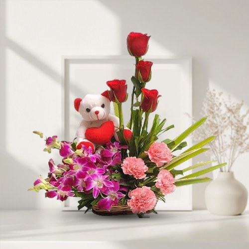 Send this lovely gift of a 6 inch Cute Teddy holding a Red Heart superbly paired with a Cane Basket decorated with 4 Red Roses, 4 Purple Orchids and 4 Pink Carnations and simply express your love to your loved ones on Valentines Day.