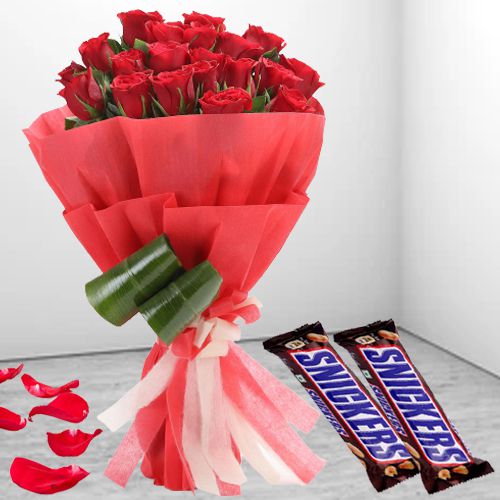 Make a love statement on Valentines Day with this gift of Wrapped with Love 20 Red Roses Bouquet in tissue wrap coupled with 2 pcs Snickers Chocolate (45g each) which is filled with your good wishes.