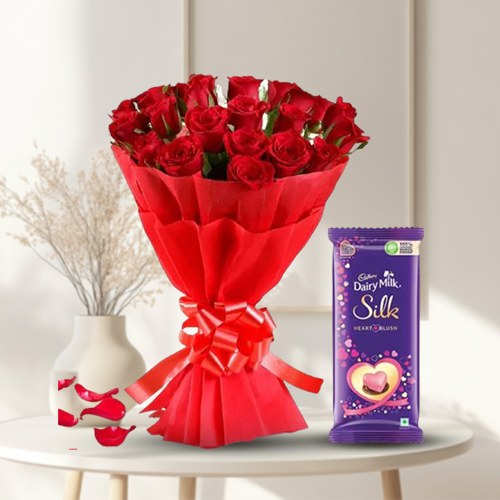 Show your intense love on Valentines Day with this gift of Blushy Valentine 24 Red Roses Bouquet in tissue wrap with Cadbury Dairy Milk Silk Valentine Heart Blush Chocolate Bar (60g) and dazzle your loved ones.