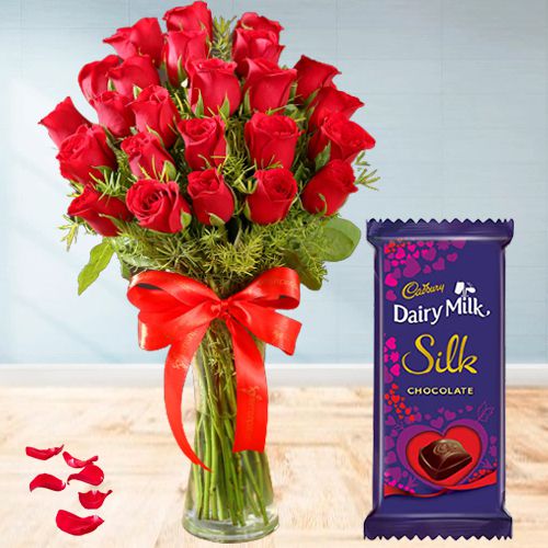 Let someone know that you have feelings for him/her by sending this Gorgeous display of 24 Red Roses in a Glass Vase (9 inches) with a Cadbury Dairy Milk Silk Valentine Chocolate Bar (60g) and sweeping them off their feet on Valentines Day.