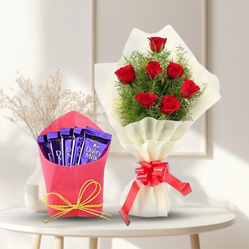 Order online for your beloved on Valentines Day, this Lovely 7 Red Roses Bouquet in Tissue Wrap with 5 pcs Cadbury Dairy Milk Chocolate Bar (24g each) that will clearly convey how much you love him/her.