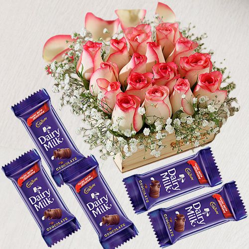 Make your Valentines Day more memorable with this Impressive Display of 16 Pink Roses in a wooden tray superbly coupled with 5 pc Cadbury Dairy Milk Chocolate Bar (13.2g) and curve your name on the hearts of the people you love.