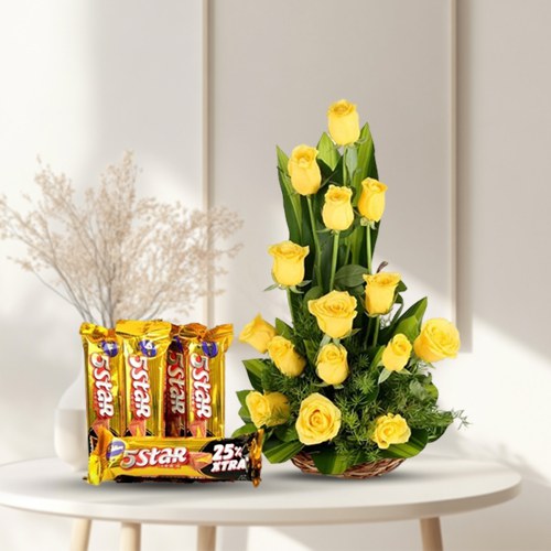 Rejoice in your lovely memories of togetherness on Valentines Day with this Cheerful Display of 15 Yellow Roses Bouquet in a Cane Basket with 5 pc Cadbury 5 Star Chocolate Bar (40g each) which will give a perfect touch to your emotions.