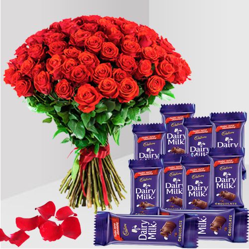Express your deepest love to your dear ones by sending them this Scarlet 50 Red Roses Bouquet elegantly clubbed with 10 pc Cadbury Dairy Milk Chocolate Bar (13.2g each) and make Valentines Day more memorable.