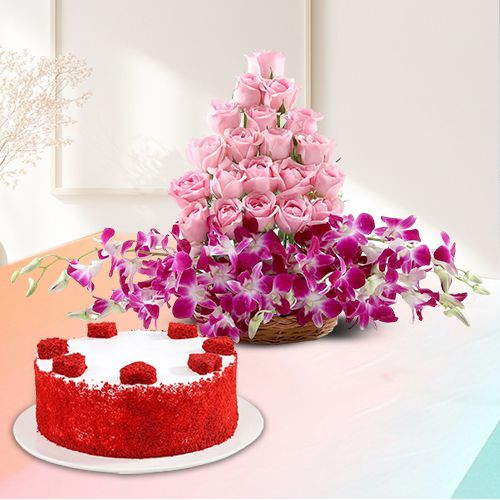 Enrich the flavor of love on Valentines Day with this gift of Charming Arrangement of 20 Pink Roses n 6 Purple Orchids in a Cane Basket paired with a Red Velvet Cake (500g) and see the joy it brings to the life of the recipient.