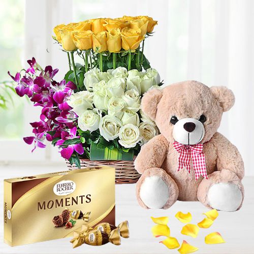 Convey all your sweet wishes through this gift of Admirable Assorted Flowers Basket with Ferrero Rocher Chocolates n 6in Teddy. This special gift for promise day is a Basket Arrangement of 50 Mixed Flowers (Yellow Roses, White Roses N Orchids) with 6in Teddy N 16pcs Ferrero Rocher Moment Chocolates and show your fondness towards the recipient on this Valentines Day.