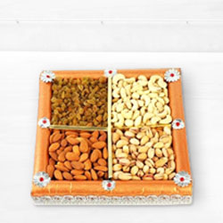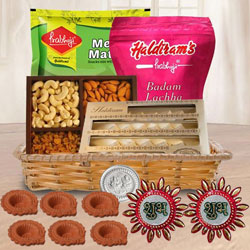 Bring the feeling of happiness by sending this Tasteful Basket of Premium Dry Fruits having Pistachio, Almonds, Rasins n Cashew (gross wt. 500g) with a decorated Vighnesh Ganesh Idol, 4 pcs decorative earthen Diya n Free Silver Plated Laxmi Ganesh Coin into the life of your most special person.