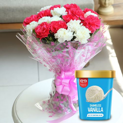 Make your mother feel rejuvenated and forget her tiredness by sending this Magnificent 15 Pink n White Carnations Bouquet with Vanilla Ice Cream from Kwality Walls (700g) on the great occasion of Mothers Day.