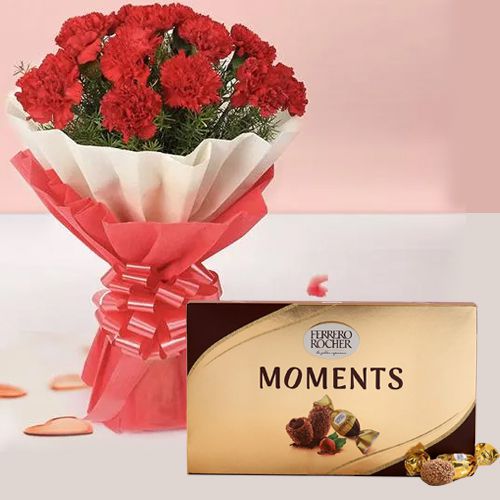 On this mothers day deliver this online with this Gorgeous Bouquet of 12 Red Carnations wrapped with a tissue and along with 16 pcs Ferrero Rocher Moments Chocolate Box with your best wishes for your mummy.
