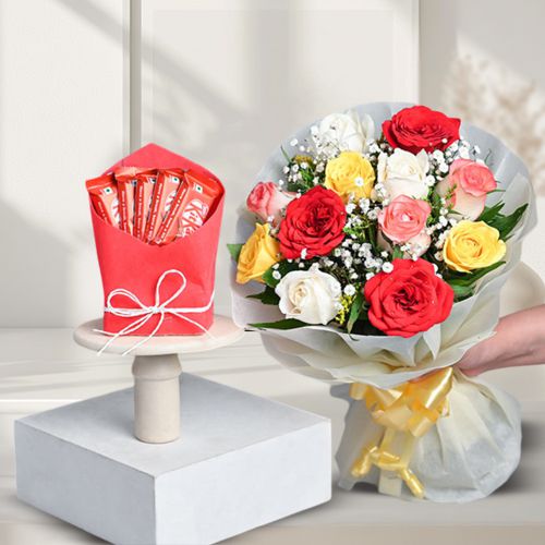 Brighten someone�s day with the Stunning Roses N KitKat Combo. This stunning arrangement includes 12 mixed roses that express a variety of feelings. Paired with five crunchy KitKat bars, this combo makes any celebration extra special. Ideal for both formal events and casual surprises, it�s designed to convey heartfelt messages mixed with a touch of sweetness. This beautifully packaged gift combo ensures that your loved ones feel truly cherished and remembered. Add joy to their lives with this perfect blend of flowers and chocolate.