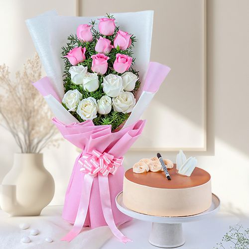 Celebrate life�s special moments with our Butterscotch Bliss N Blooms! This enchanting bouquet comprises 8 pristine white roses and 7 cheerful pink roses, complemented by a touch of green fillers for that fresh burst of nature. Wrapped in chic pink and white non-woven paper, it sets the perfect stage for a sweet surprise. And what�s better than flowers? A delectable eggless butterscotch cake (1 lb) to delight your taste buds! This combo is ideal for expressing love, gratitude, or simply brightening someone�s day. Let the blend of vibrant flowers and creamy cake do the talking!