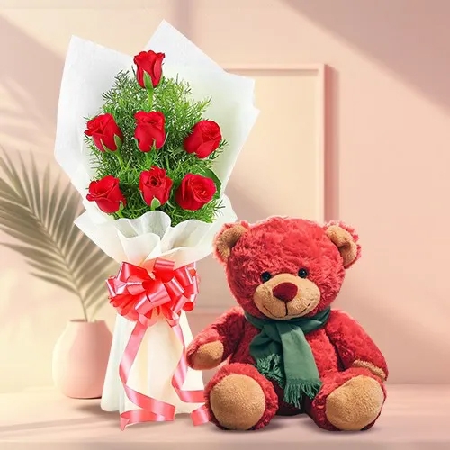 This Womens Day gift combo has: � Bouquet of 7 Red Roses with Green Color Delhi Asparagus Fillers Wrapped with a White Tissue Paper � 6 Inch Red Teddy