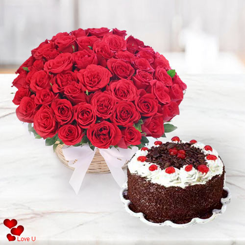 50 Red Roses with Black Forest cake 2 Kg from 5 Star Bakery