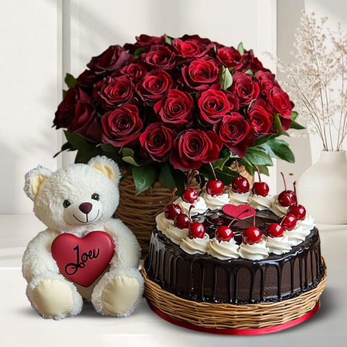 Buy this lovely combo of 25 Red Roses Arrangement with 1 Lb Black Forest Cake and a soft Teddy Bear (6 inch) to surprise and delight your near and dear ones and make them feel special.
