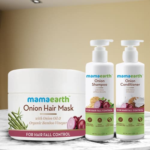 This gift combo has: � Mamaearth Onion Conditioner with Onion N Coconut � Mamaearth Onion Hair Mask for Hair Fall Control � Mamaearth Onion Hair Fall Control Shampoo with Onion N Plant Keratin