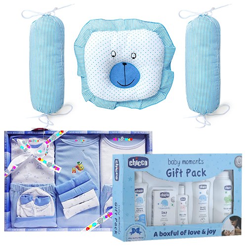 Now you can send online this Charming Gift of Baby Dress N Chicco Gift Set with Pillows and spread warm love to others. This Combo comprises of: 1. a. Item: 13 pc Dress Set b. Age Group: Ideal for 0-3 Months c. Color: Blue d. Fabric: Cotton 2. a. Item: Chicco First Cuddle Gift Set b. Brand: Chicoo c. Item Dimensions: 17 x 6.4 x 17 cm d. Age Group: 1 month and up 3. a. Item: Super Minis Cotton Baby Head Pillow with 2 Side Pillows b. Color: Sky Blue c. Age Group: 0-12 Months Note:- Country of Origin: India