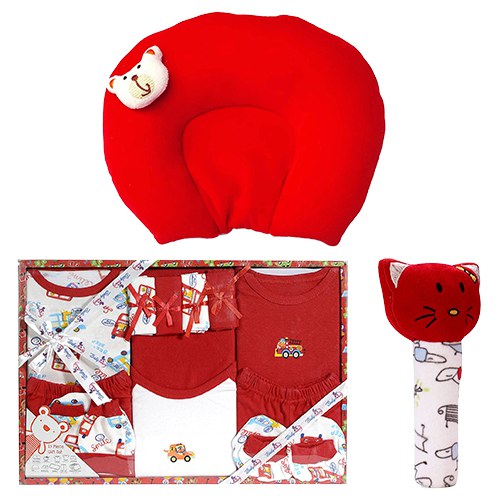 Click to deliver this Marvelous Gift of Baby Clothing Set with Neck Supporting Pillow N Soft Toy for toddlers that delivers happiness instantly when unwrapped. This Combo comprises of: 1. a. Item: 13 pc Dress Set b. Age Group: Ideal for 1-3 Months c. Color: Red d. Fabric: Cotton 2. a. Item: Soft Neck Supporting Baby Pillow b. Color: Red c. Fill Material: Mustard Seeds d. Material: Velvet e. Item Dimensions LxWxH: 21 x 5 x 23 cm 3. a. Item: Kitty Face Rattle Cum Soft Toy b. Color: Red c. Material: Plush Note:- Country of Origin: India