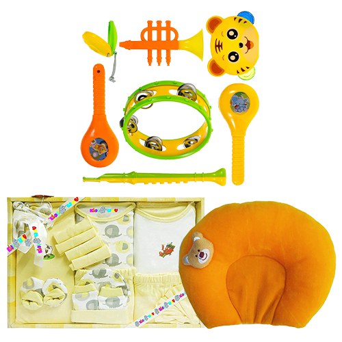 Gift this Wonderful Clothing N Rattle Set with Neck Supporting Pillow for New Born to keep your beloved smiling and happy. This Combo comprises of: 1. a. Item: 13 pc Dress Set b. Age Group: Ideal for 0-3 Months c. Color: Yellow d. Fabric: Cotton 2. a. Item: Soft Neck Supporting Baby Pillow b. Color: Yellow c. Fill Material: Mustard Seeds d. Material: Velvet 3. a. Item: 7 pc Rattle Set b. Color: Multicolor c. Material: Plastic d. Special Feature: Made of safe, non-toxic, FOOD GRADE plastic and paints Note:- Country of Origin: India