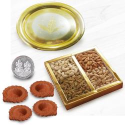Dry Fruits 500 gms. with 4 Silver plated Bowls containing Cashew Nuts, Good Quality Raisins, Almonds and Apricots with Free Silver Plated Laxmi Ganesh Coin.