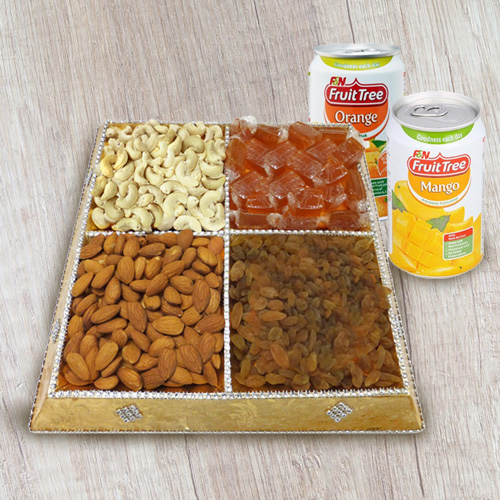 Pour the feelings of your heart into this delicious Dry Fruits Box with Mango Juices to make the recipient of this gift realize your intense love for them. This enjoyable Tray is packed with 50 gm Almonds, 50 gm Raisins, 50 gm Cashews, 50 gm Mango Toffees and 2 Cans of Fruit Tree Orange Mango Juices. Note: Tray design may vary depending on availability.