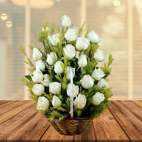 Wishes are delivered in the most stunning way by gifting this Passionate Basket of 25 White Roses for lovely people in a lovely way.