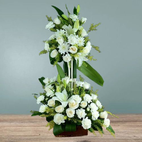 Product Details: Flowers: 18 White Carnations, 18 White Roses and 2 stem White Lilies (2*3 buds/flowers), 3 White Carnations to add height to the basket Gift Type: A Tall Basket Arrangement Gift Height: 37 Inch