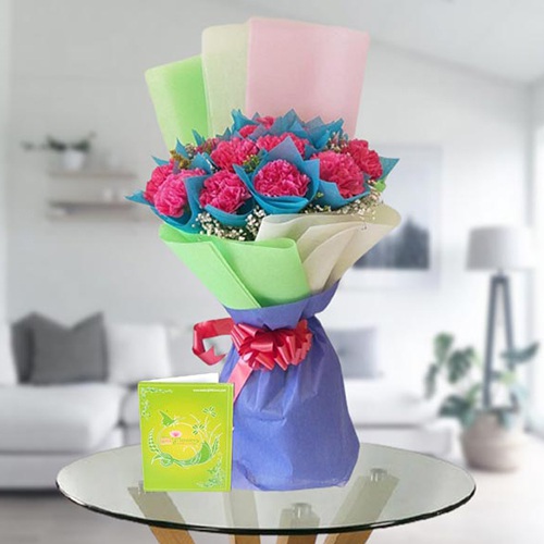 Gift your mummy this Charismatic 12 Pink Carnation Bouquet wrapped beautifully with Tri Colour Tissue Wrap and added with Card which will rekindle the loving gesture from her on this Mothers Day.