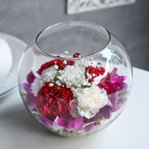 This Table Top arrangement has: a) 6 Red N White Carnations b) 2 Orchids c) A Glass Fish Bowl