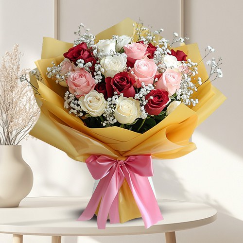 Surprise your loved ones with a burst of sunshine and beauty with our Beautiful Arrangement of Mixed Roses. This delightful arrangement features 10 mixed roses, carefully handpicked to create a stunning visual display. Each rose represents a ray of happiness, bringing warmth and joy to any occasion. Wrapped in yellow tissue, this bouquet radiates positivity and is sure to brighten up anyones day.