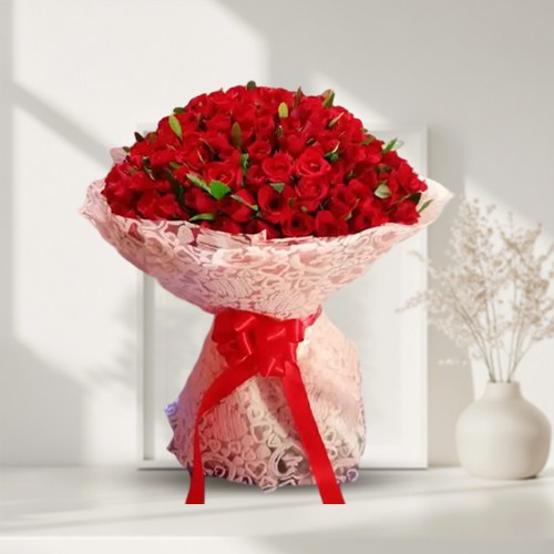 Make a grand gesture of love with this Romantic Red Roses Grand Bouquet. It showcases 100 red roses that symbolize passion and romance. Each bloom is carefully handpicked and exquisitely wrapped with love, creating a breathtaking display that will leave your loved one speechless.