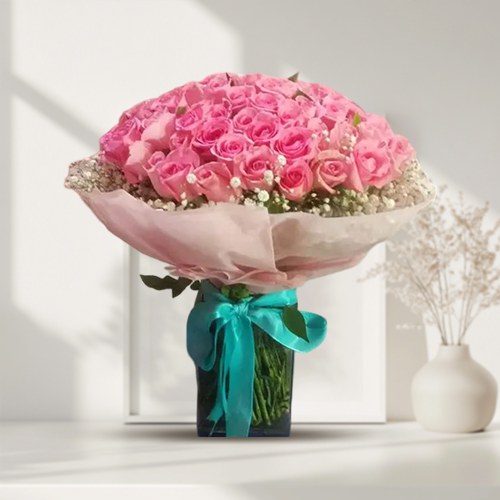Unleash the power of elegance with our "Elegance Redefined" arrangement. Crafted with utmost care, this delicate ensemble boasts 50 enchanting pink roses nestled in a stylish glass vase. Let the charm of these roses redefine sophistication and bring a touch of grace to any occasion.